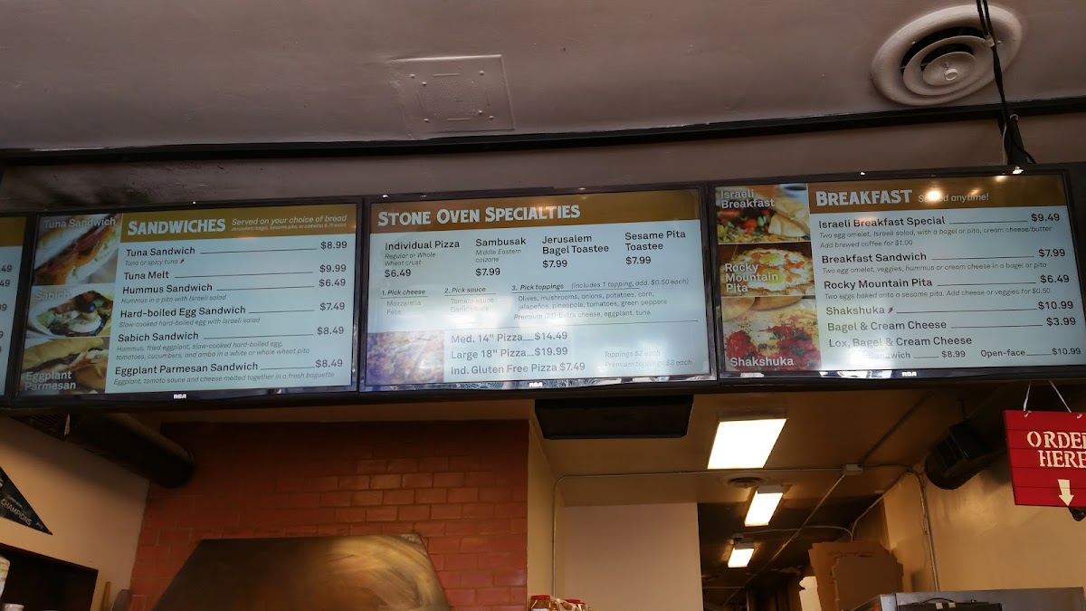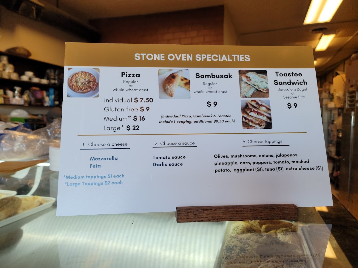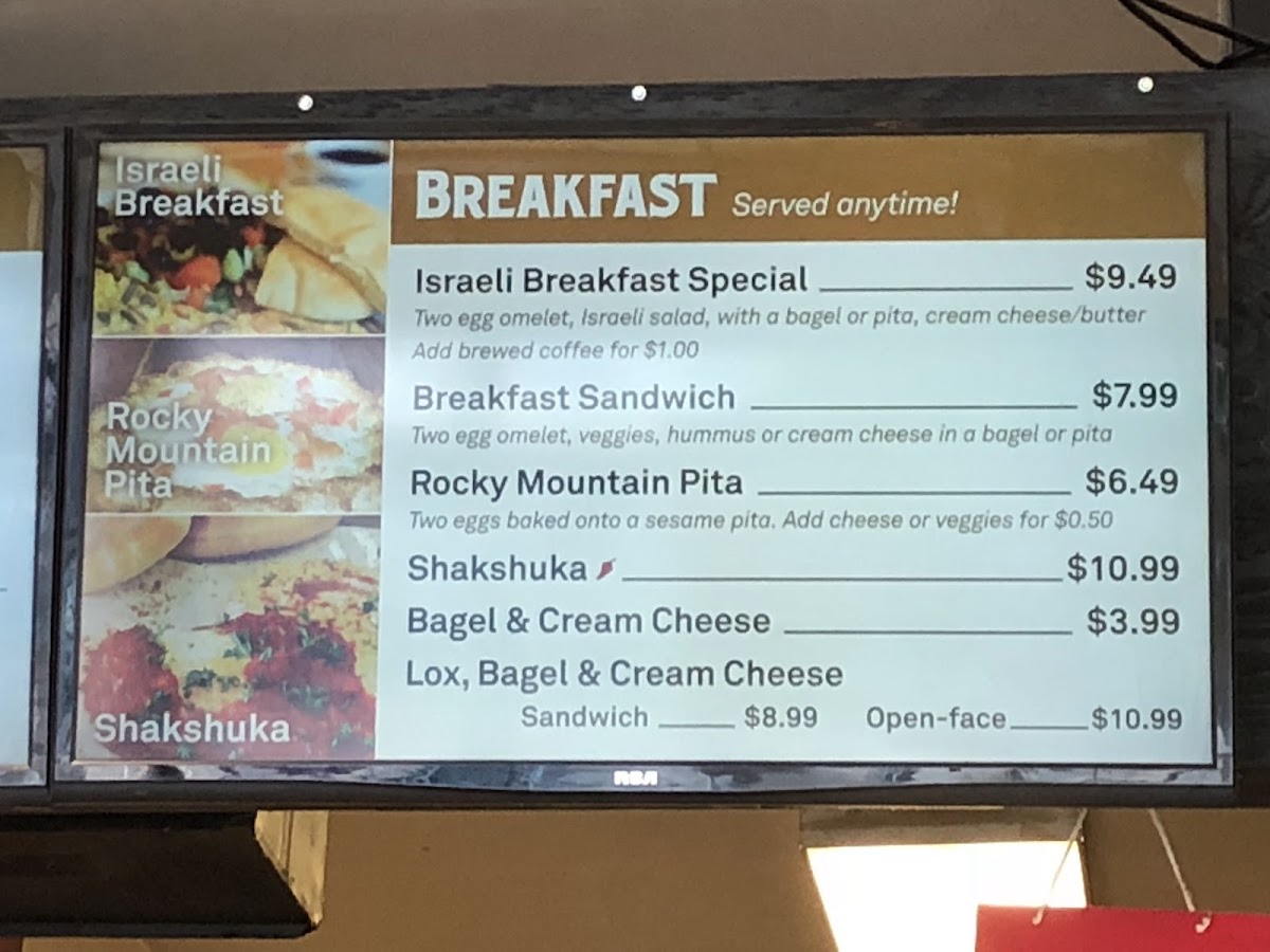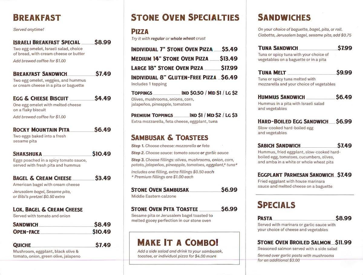 Two egg omelette, Israeli salad, your choice of bread, with cream cheese or butter. Add a brewed coffee for $1.00.