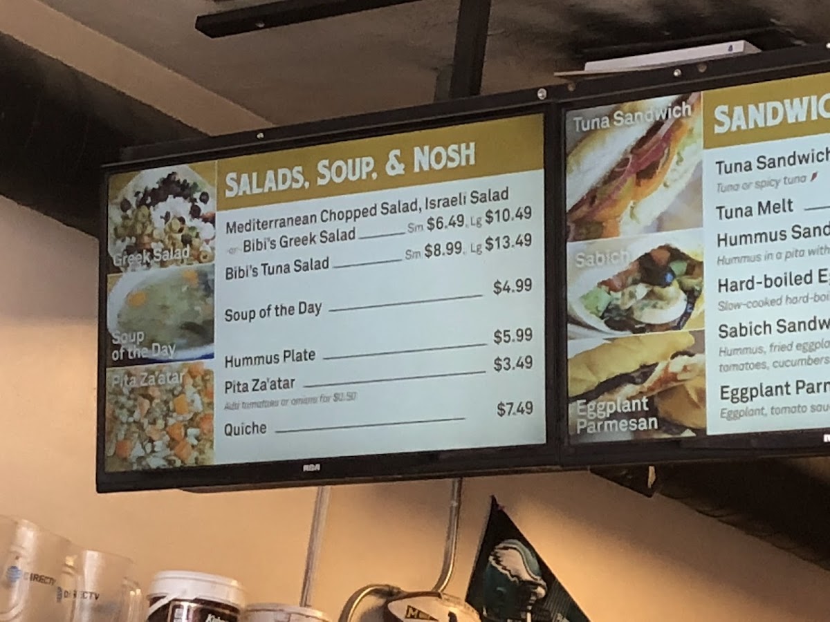 Hummus, fried eggplant, slow-cooked hardboiled egg, Israeli salad and amba (pickled mango sauce) served in a fresh Bibi's pita.